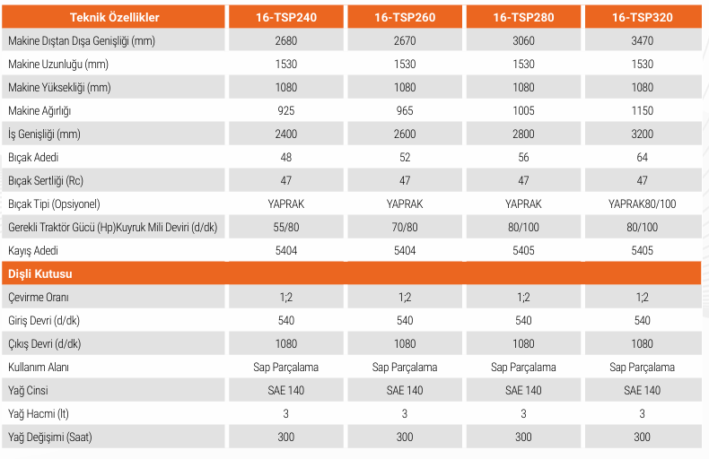 Sap Parçalama Makinası: Hasat sonrası tarlada kalan bitki artıklarını (anız) parçalamada kullanılır. Mahsullerin hasadı sonrası biçerdöverin bıraktığı sapları ve bitki artıklarını küçük parçalara ayırır. Bitki artıklarının ufalanması ve toprağa kolay karışmasını sağlar. İstenildiği takdirde yeşil otları biçme makinası olarak da kullanılabilir. • Sap parçalama makinası sayesinde bitki artıkları toprağa karışır ve toprağın organik madde miktarı toprağa geri kazandırılır. Böylelikle topraktaki organik yaşam sürdürülmüş olur ve bir sonraki ekim dönemi için organik madde açısından zengin, daha verimli bir toprak elde edilir. • Islak bitki artıkları ve sapları rahatlıkla parçalar. • Canlı bitki saplarını, dallarını biçmek için de kullanılır. STANDART EKİPMANLAR • Uluslarası 3 askı CAT II bağlantı sistemi • 1 3/8’’ z6 çapında 6 kamalı pto korumalı şaft • 750 rpm PTO; 1900 rpm rotor hızı sağlayan şanzıman • 21 cm boyunda 10 cm kalınlığında Y bıçaklar • 4 - 5 ( 280 - 320 ) aktarma kayışı; tek noktadan sağlanan aktarım grubu • Yükseklik ayarlı düz merdane • Ön koruma zincirler